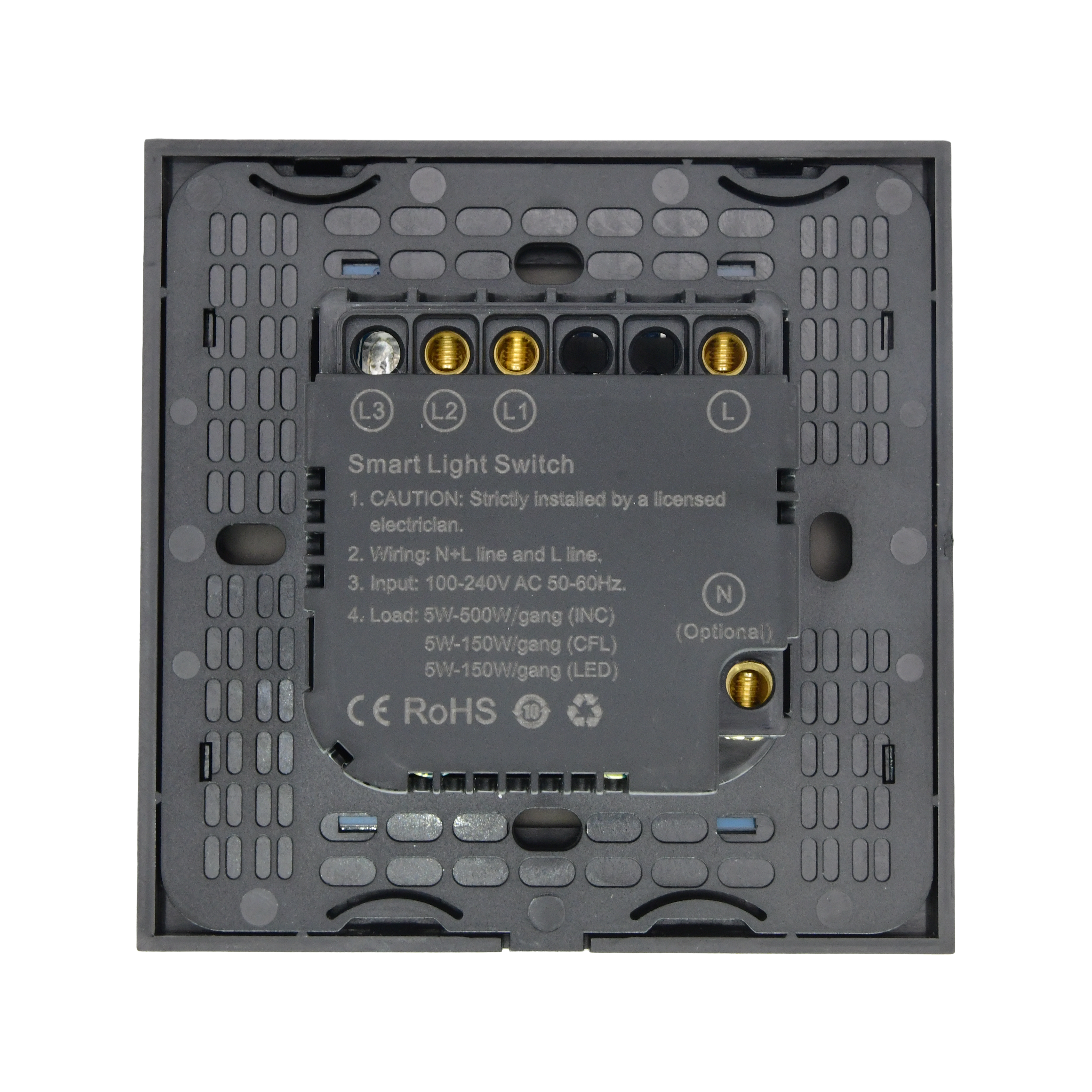5-500W/gang (INC); 5-150W/gang (CFL); 5-150W/gang (LED)