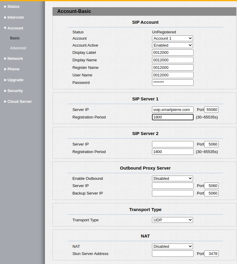 - Display Label, Display Name, Register Name, User Name: Enter the Intercom ID (prefixed with 00) and its corresponding FreePBX password.
